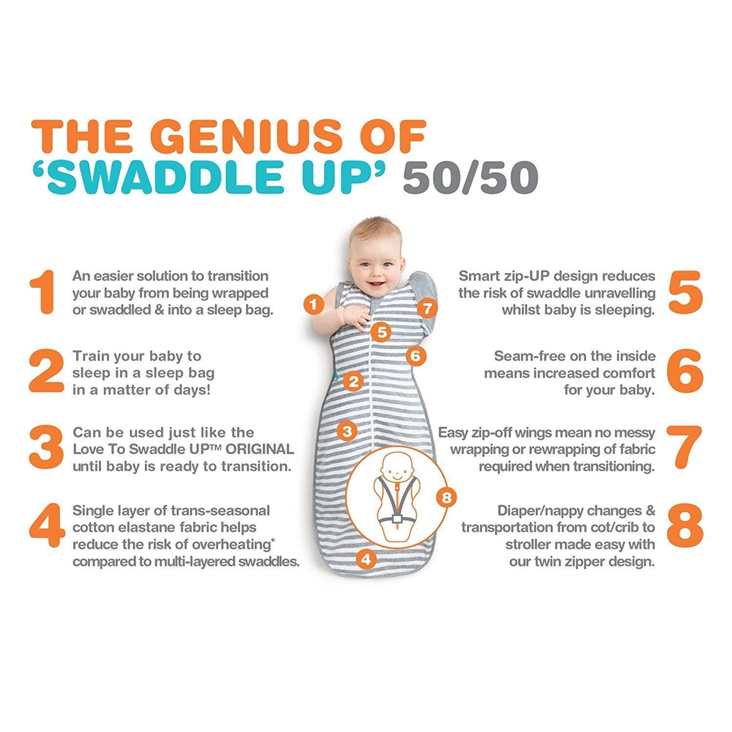 The Swaddle UP™ 50/50 helps your baby to gradually adjust to sleeping un-swaddled. Simply unzip one ‘wing’, wait a few nights for your baby to adjust to the sensation of sleeping with one arm released, & then remove the second wing. Your baby is now transitioned!